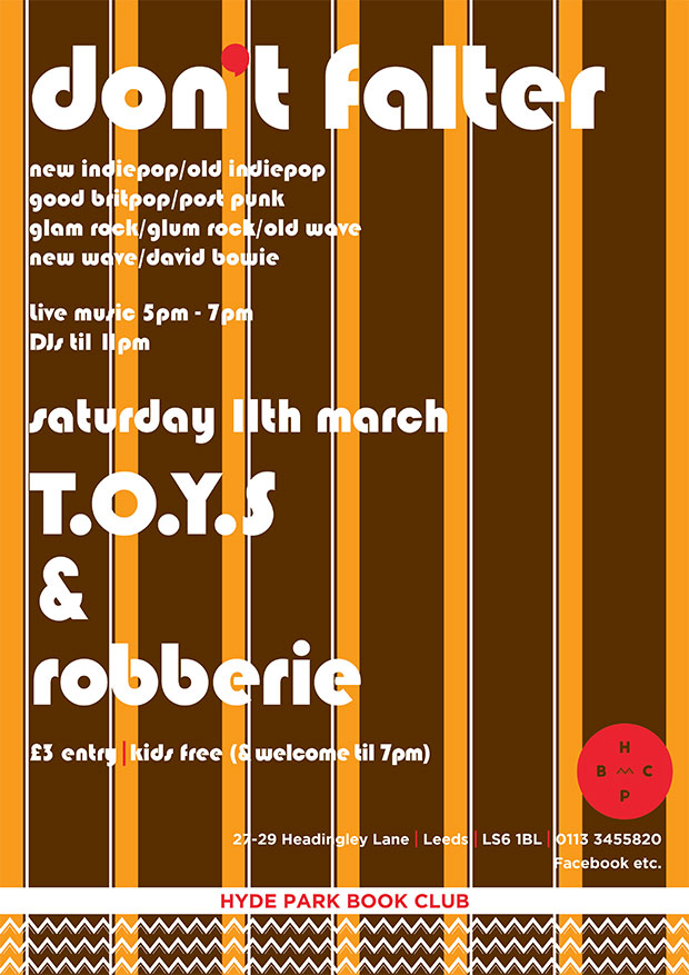 On Saturday 11 March we’re back at Don’t Falter in Leeds supporting T.O.Y.S. We had a lovely gig there a couple of years ago and are looking forward to going back. It’s a family-friendly tea time show with indie disco afterwards.